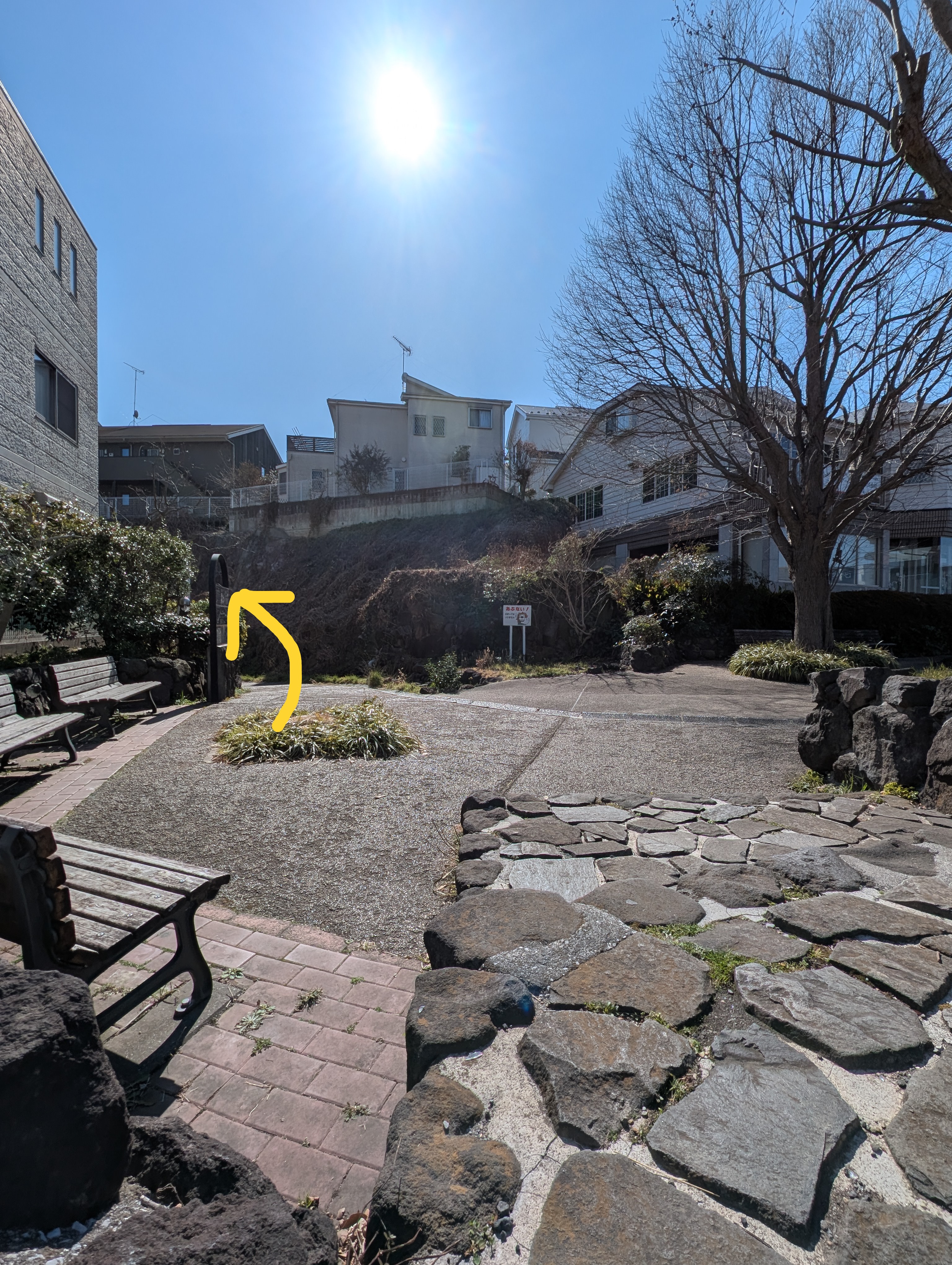 公園の左手(矢印の方向)へ入ると緑道です。